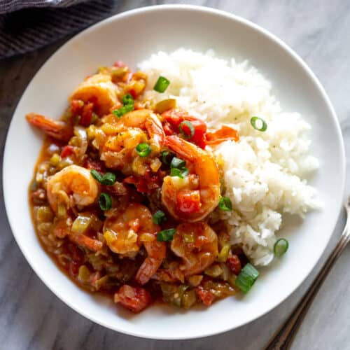 Gulf shrimp slow cooked with bell peppers, celery, onions, herbs and spices in a rich, red Creole sauce.